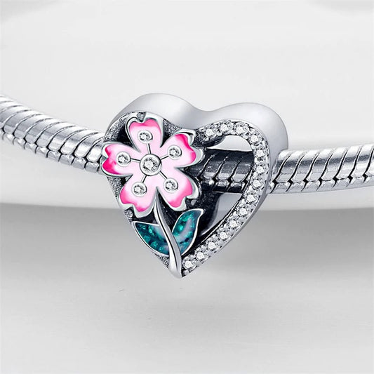 Pink Flower Charm Sterling Silver S925 Love Heart