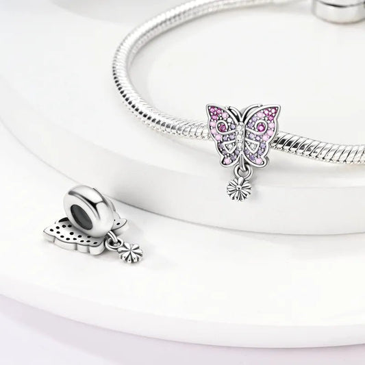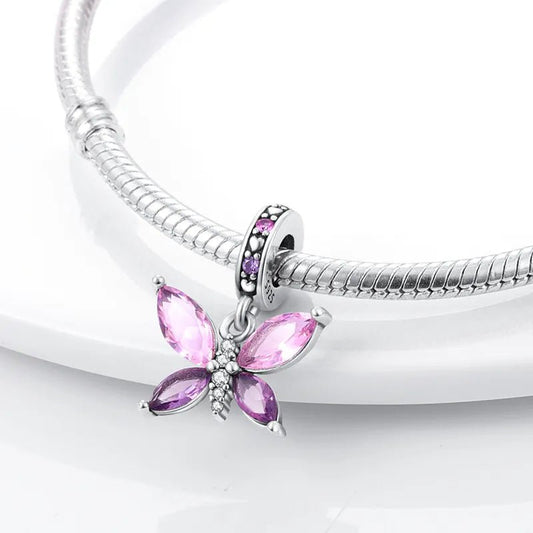 Pink Purple Butterfly Charm Sterling Silver S925 Dangling Flower